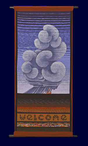 Artist: Caroline Rackley Commissioned by: Southside Quaker House, Santa Fe, New Mexico, 2008 Measurements: 30 " x 70" Materials: Handwoven fabric, applied acrylics, wooden rods